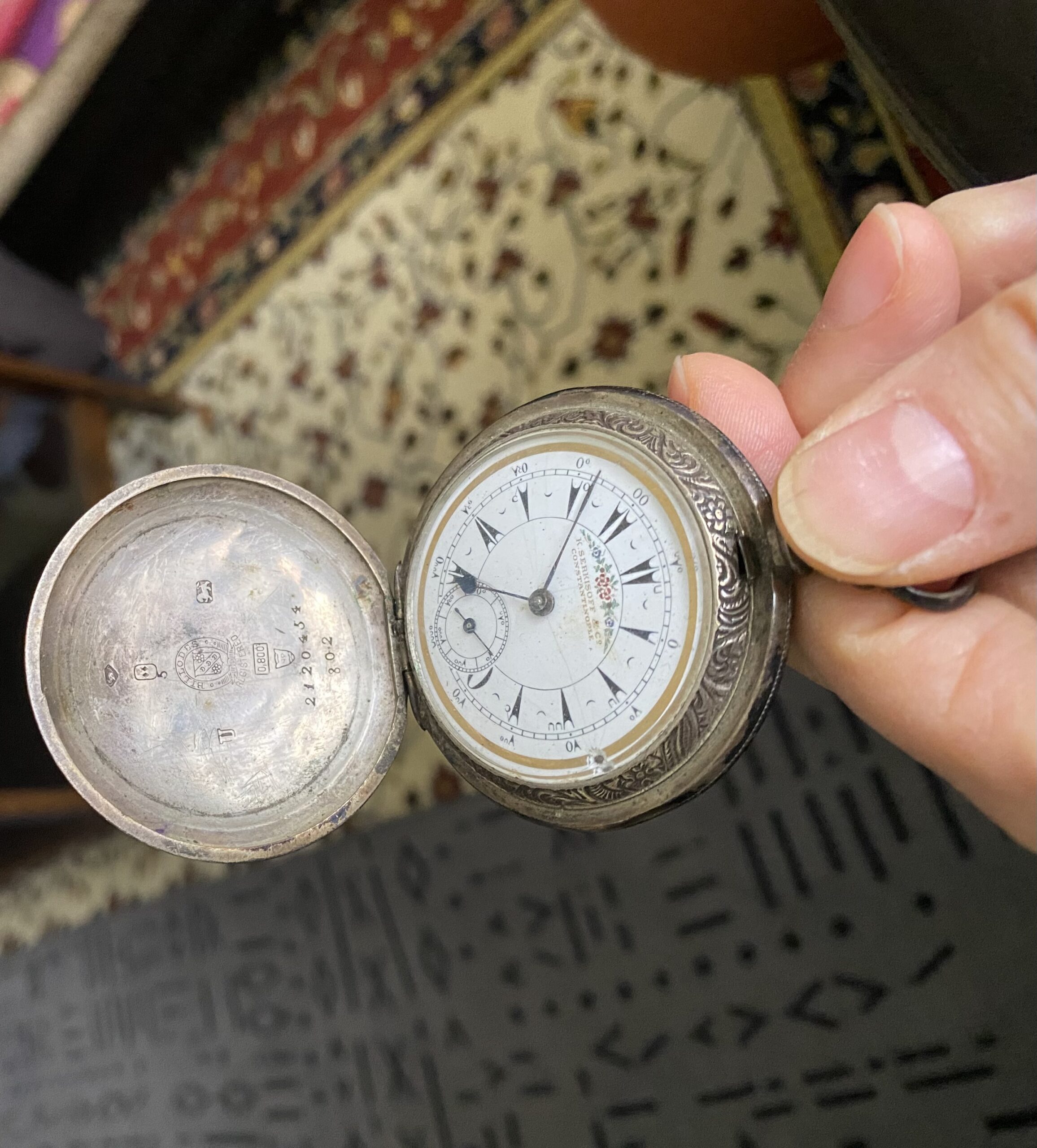 GÜMÜŞ NADİR BULUNAN BİR ANTİKA CEP SAATTİR.1865 – 1900 yılları arasında ” Serkisof Co & Constantinepole ” marka ismi Billodes