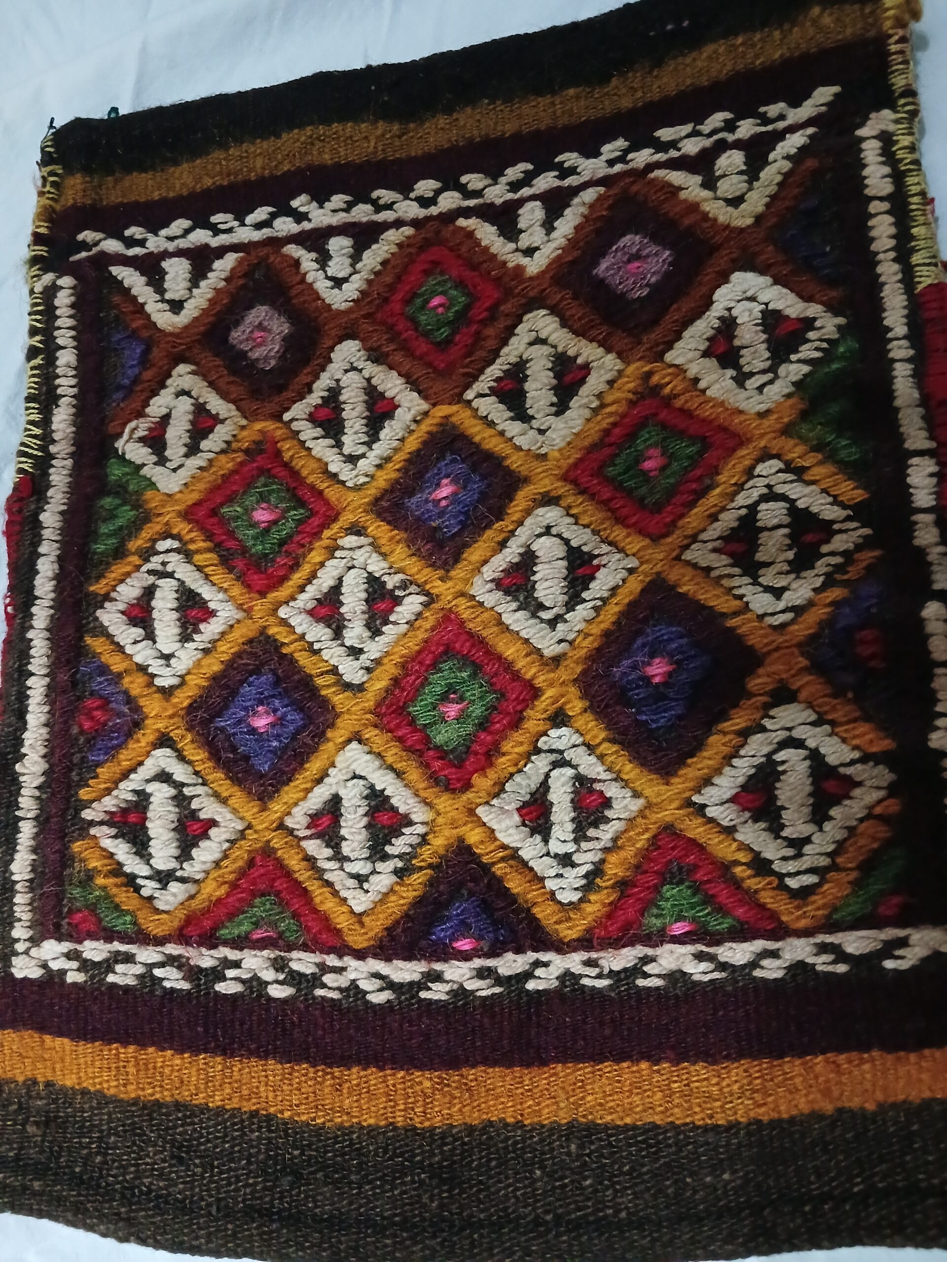 Bu heybe bizzat babaannem tarafindan koyun yünleri iplik yapılmış kök boyalarla boyanmış ve tahta dokuma tezgahında kendi tarafından dokunmuştur. Babannemin çeyizinden bir parça yaklaşık 100, 150 yıllık. Hiç bir deformasyonu yoktur. Askı kısmı antika değildir. 53 yaşındayım. Bulgaristan göçmeniyiz. Babamlar 1950 senesinde gelmişler Türkiye’ye.