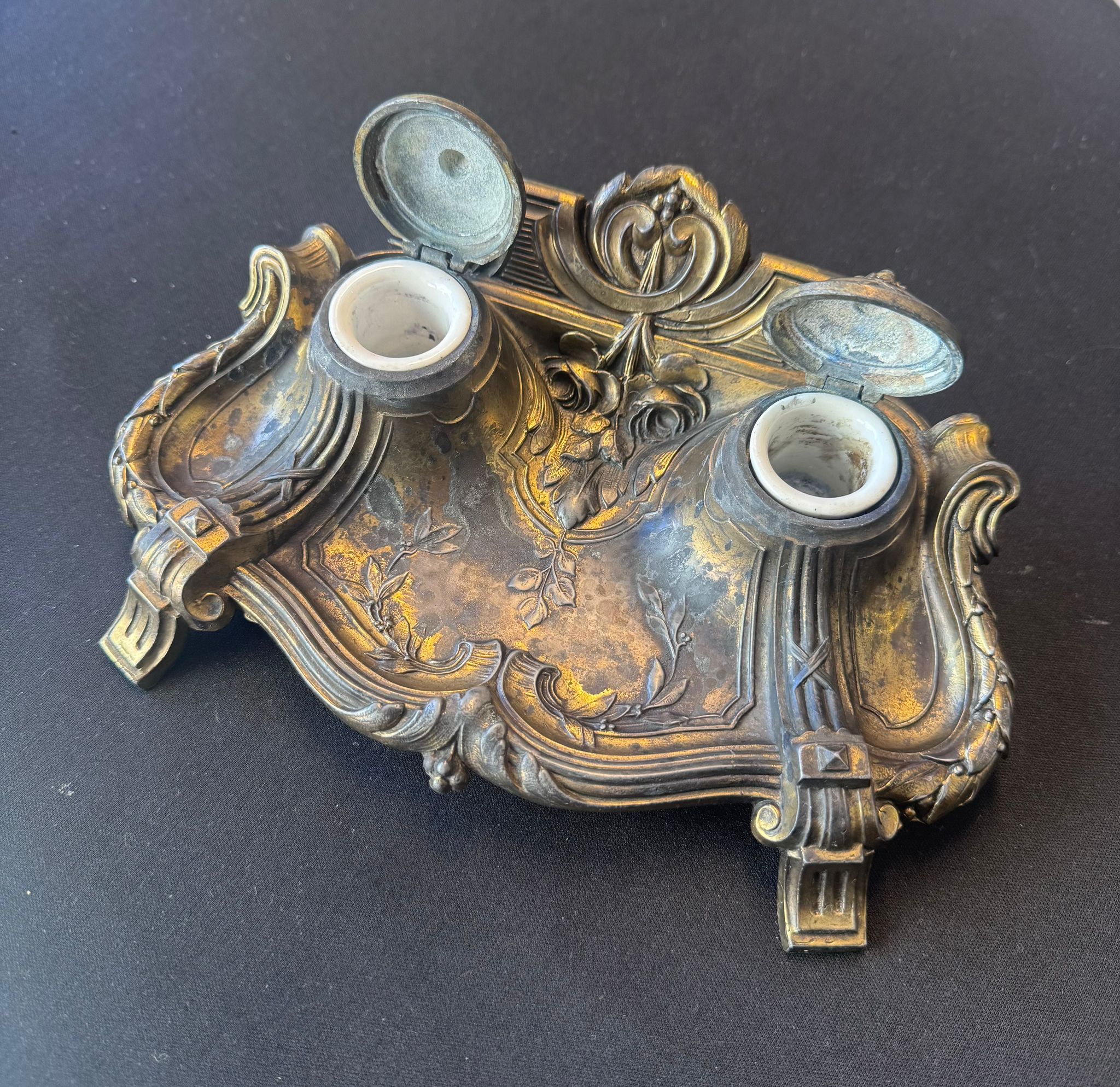 BRONZDAN MAMUL HOKKA ESKİ DÖNEM DEPOSE DAMGALI İÇİNDE ORJİNAL PORSELEN MÜREKKEPLİKLERİ DURUYOR. ÇOK ESKİ TEMİZ KULLANILMIŞ. ÖLÇÜLERİ 21 CM X 16 CM DİR.