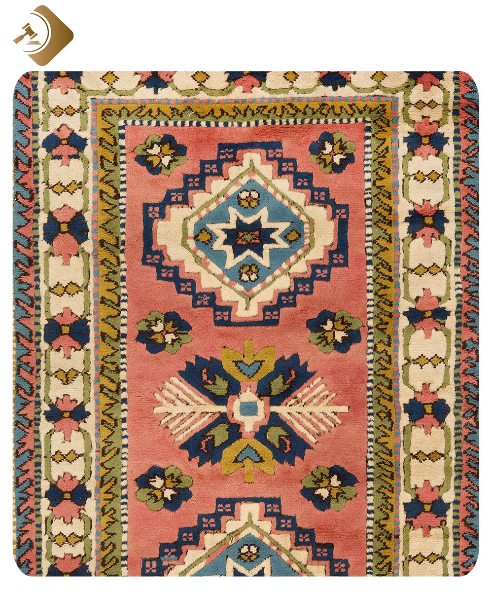 El Yapımı Antika Kars Halısı. Yünden yapılmıştır. Gül rengi zemin üzerine merkezi bir madalyon ve iki büyük baklava motifi vardır.
