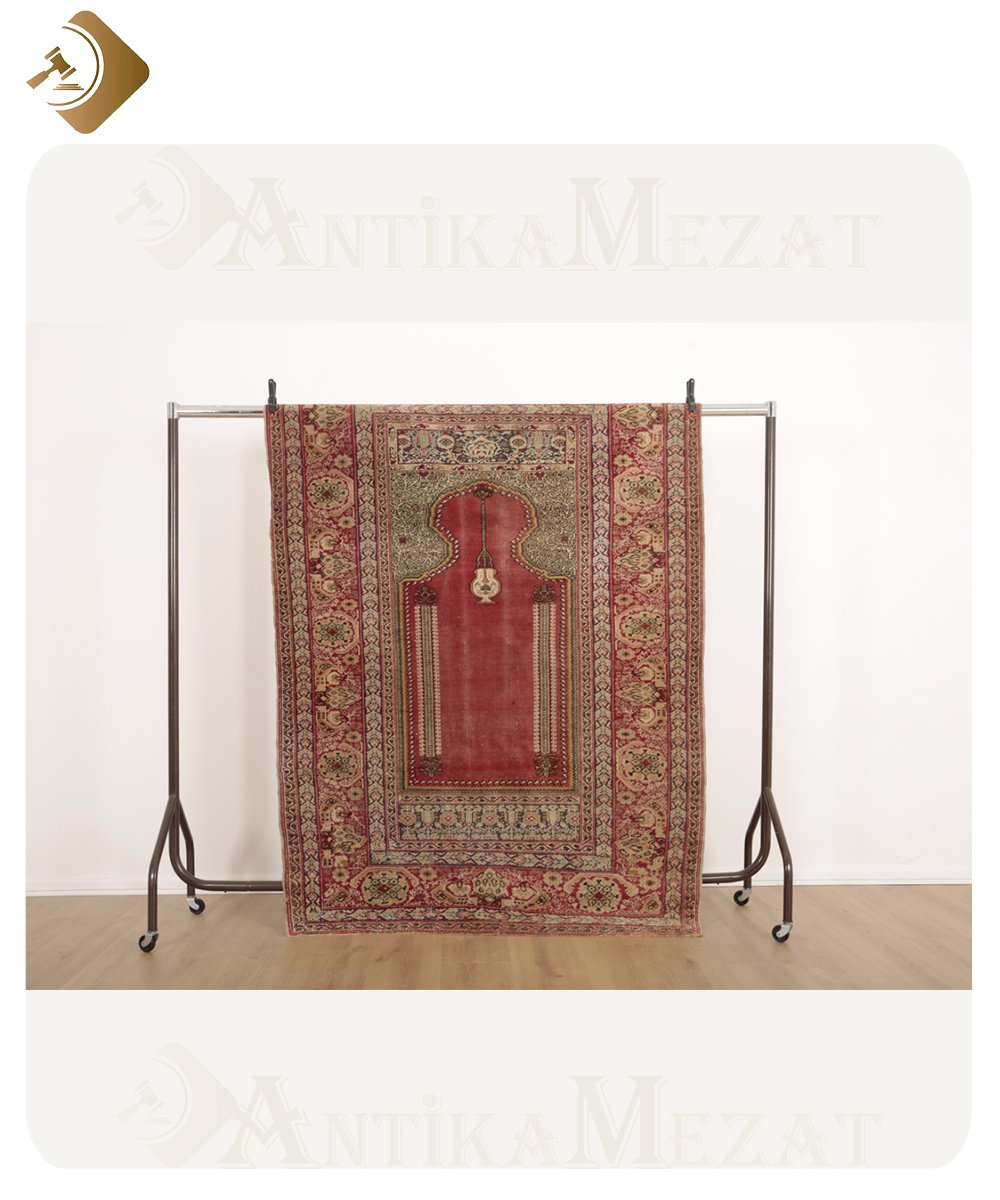 El Yapımı Antika Seccade. Açık zemin üzerine, yoğun çiçek bordürler bulunur. Soluk renk ve hardal renginde dokunmuş, Sütunları bulunan seccade, 180cm x 131cm