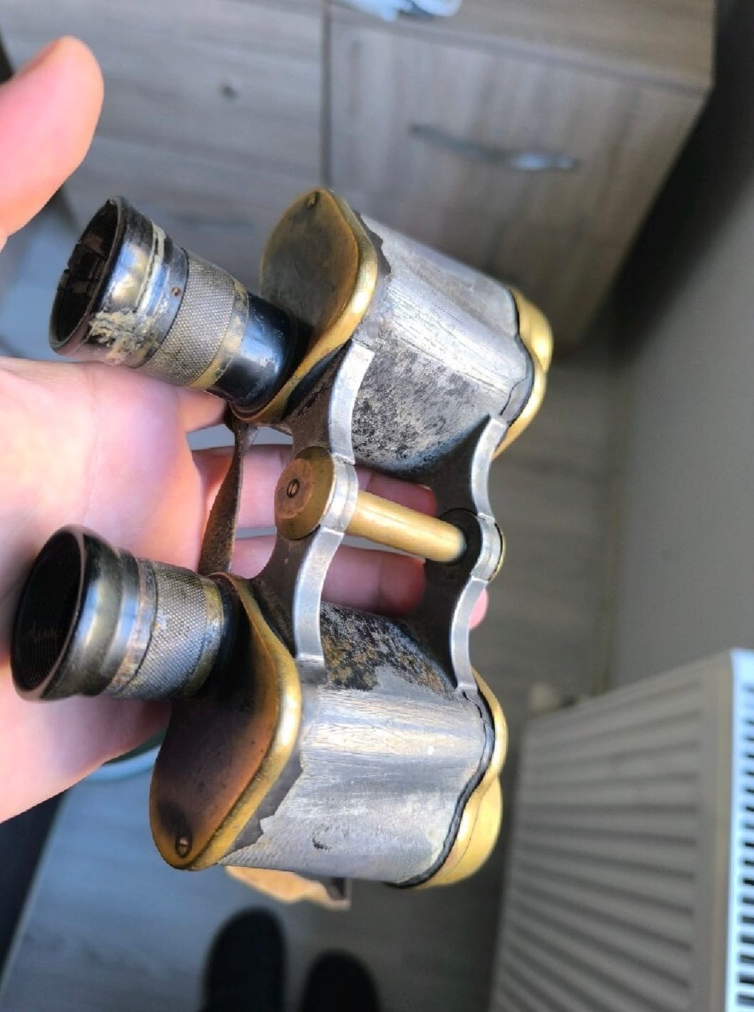 19. yüzyıl sonu – 20. yüzyıl başına tarihlenen, Varşova merkezli KOWSKI i S-ka firmasına ait, pirinç gövdeli, deri kaplamalı antika opera savaş dürbünüdür.